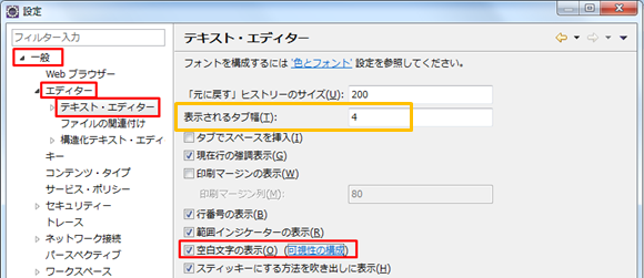 Eclipse タブや空白の表示設定方法
