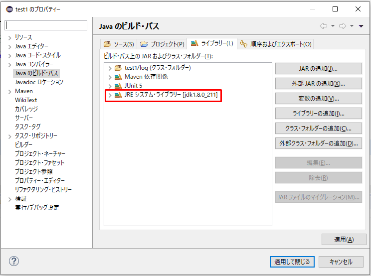 上記を設定するとプロジェクト配下のJREシステム・ライブラリーに反映されます。