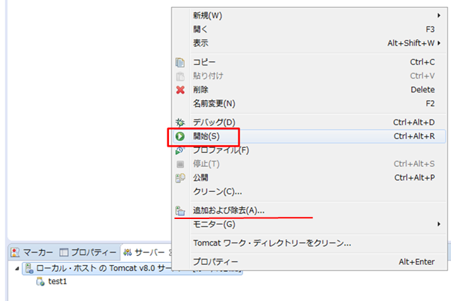 「サーバー」タブの「ローカルホストのTomcat v8.0サーバー」 の箇所で右クリックし「開始」をクリックします。