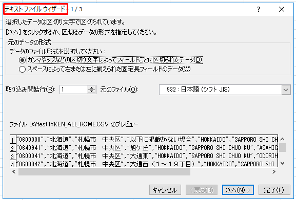 3.「テキストファイルウィザード」で読み込み行ってエクセルのシートに反映させます。