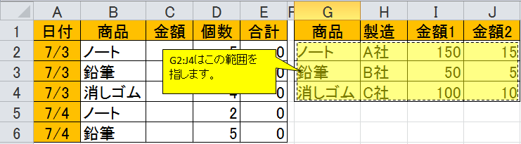 • 「範囲」は、G2:J4を入力します。表2の商品の行と列を指します。(下図参照)