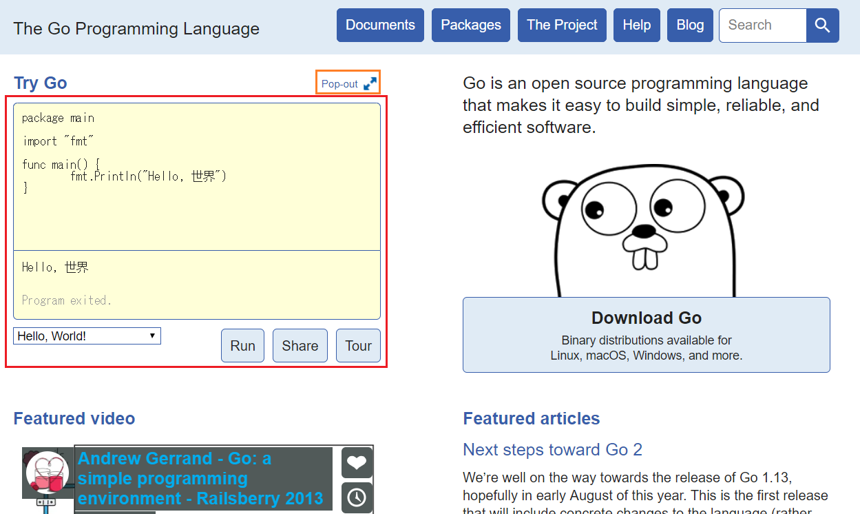Go言語の公式サイトでGo言語を動かして確認できます。
