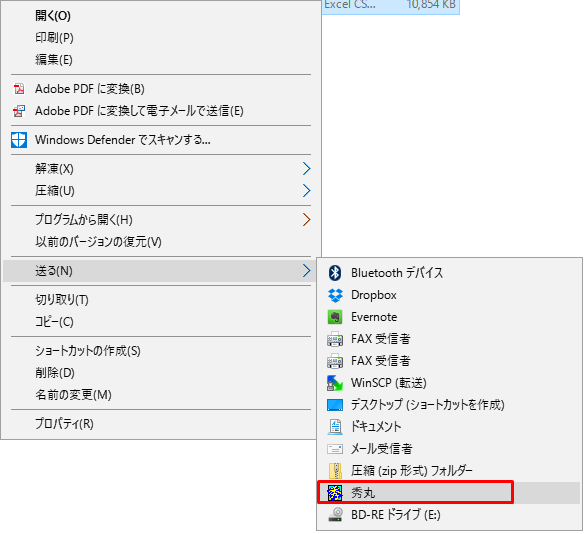 4.以下のように、コンテキストメニューの「送る」に「秀丸」が追加されます。