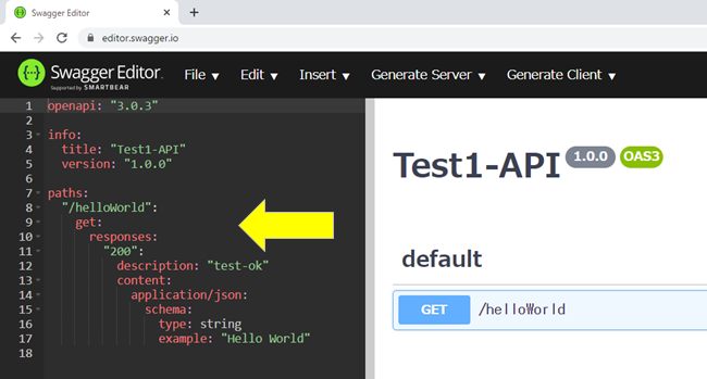 2.以下は、hello worldのコードです。Swagger Editorの左側にはりつけます。