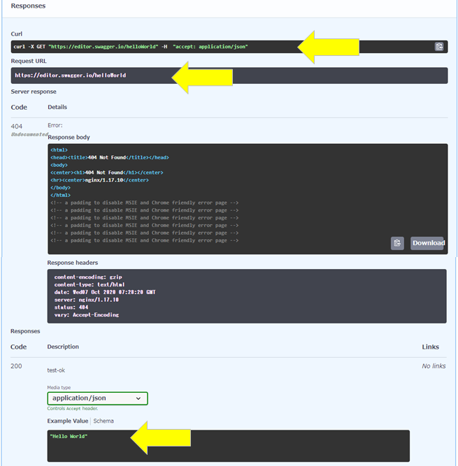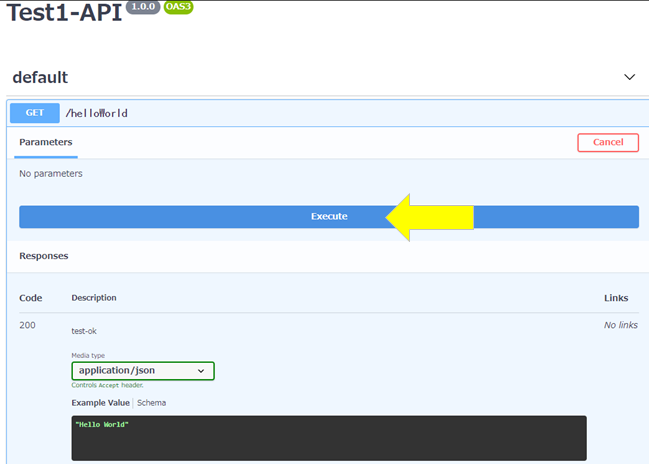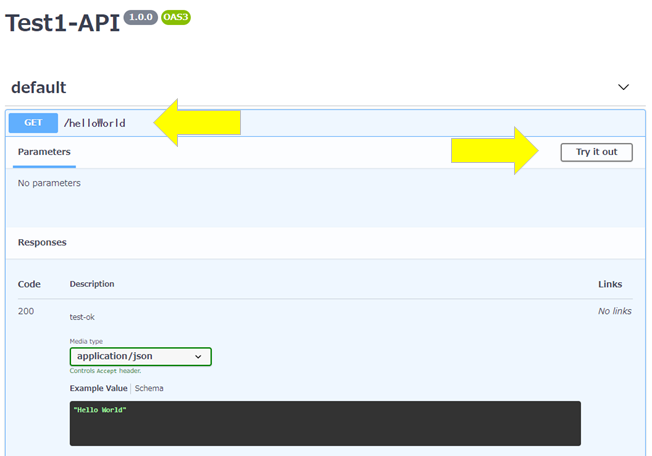 仕様としては、GETで/helloWorldにパラメータなしでアクセスし、正常(200)のときは、文字列が返ります。