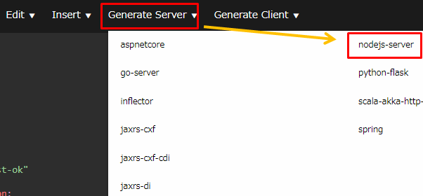 1.Swagger Editorの上部にあるGenerate Serverからnodejs-serverをクリックします。