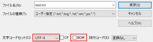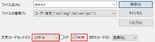 1.サクラエディタで数値の「123」の3文字を入力して「名前を付けて保存」からUTF-8を選択しBOMにチェックを付けて保存します。