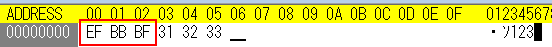 3.バイナリエディタで見るとEF,BB,BFがついています。これがBOMです。