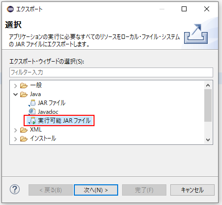 4.「実行可能JARファイル」を選択し次へをクリックします。