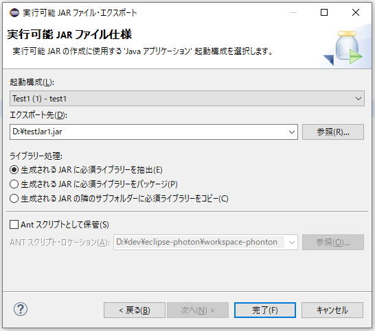 ライブラリー処理は、「生成されるJARに必須ライブラリーを抽出」を選択します。