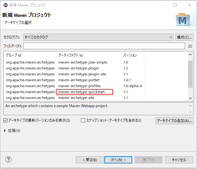 ・新規作成時、アーキタイプの選択でプロジェクトの雛形を作成できます。