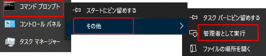1.コマンドプロンプト>その他>管理者として実行をクリックします。