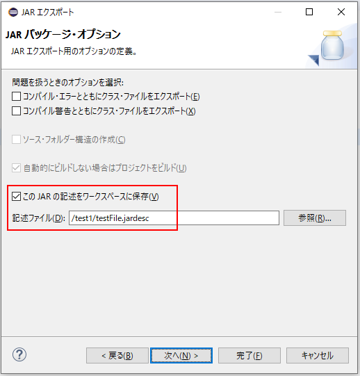 4.「このJARの記述をワークスペースに保存」にチェックを入れ、jardescファイルを入力します。