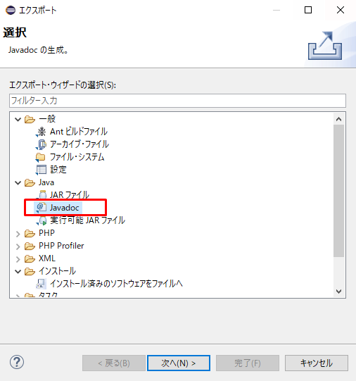 2.プロジェクトまたはファイルを右クリックし「エクスポート」から「JavaDoc」を選択し次へを押して行き出力します。