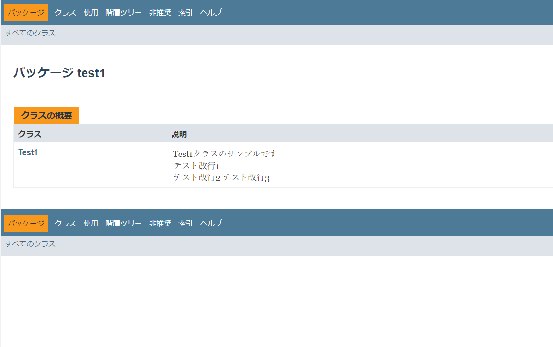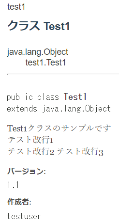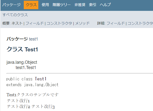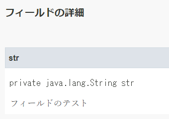 Javadocでそれぞれクラス、フィールド、メソッドの説明になります。