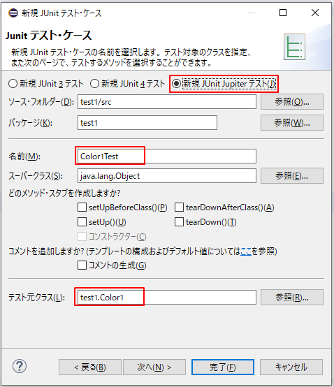 3.テストするクラスとメソッドにチェックを入れ、「完了」を押します。