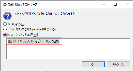 4.JUnit5ライブラリがビルドパスに追加されていない場合、以下のダイアログが表示されます。「JUnit5ライブラリーをビルド・パスに追加」の上にある「次のアクションを実行」を選択して「OK」を押します。