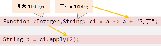 Function <Integer,String> c1 = a -> a + "です";