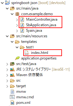 3.MainControllerクラスでSyainクラスにセットされたJSONの値を、コンソールに出力+index.htmlにJSONを返す。