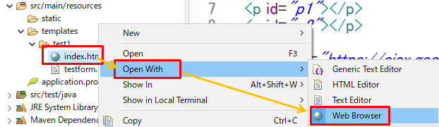 index.htmlを右クリック→「Open With(次で開く)」→「Web Browser(Web ブラウザー)」。
