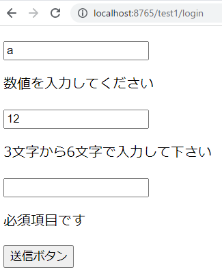28行目は画面の値がTest1Formにセットされ、@Validatedで入力チェックが行われます。