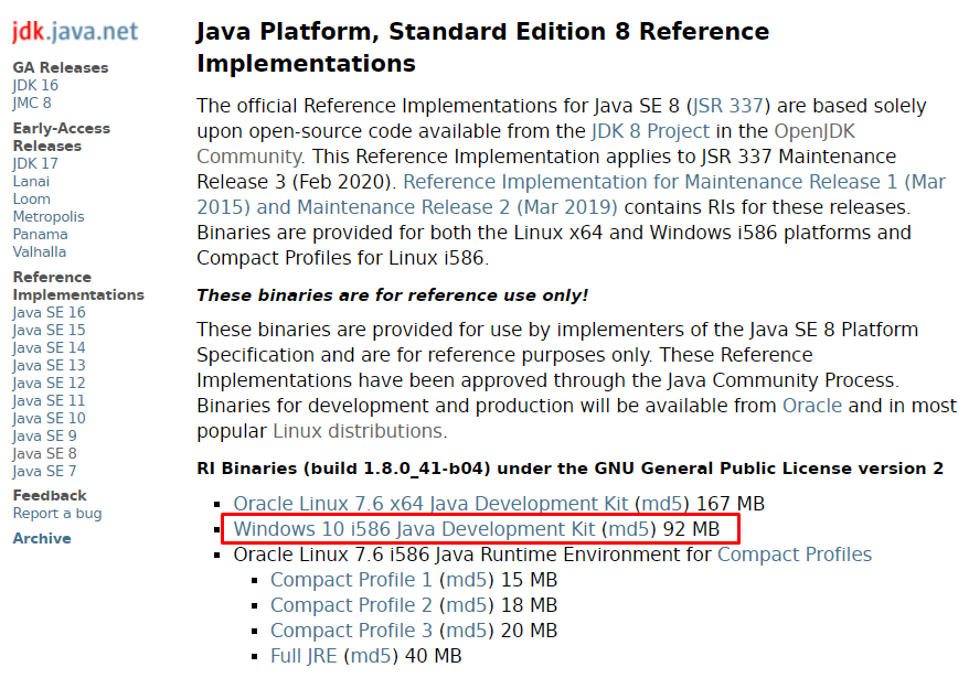 2.「Windows 10 i586 Java Development Kit(md5)」をクリックするとzipファイルのダウンロードが始まります。ファイル名はopenjdk-8u41-b04-windows-i586-14_jan_2020.zipでした。