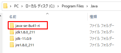 3.zipファイルを解凍し、任意の場所に配置します。C:\Program Files\Java配下にjava-se-8u41-riフォルダを配置しました。