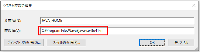 5.「変数名」に「JAVA_HOME」を入力し、「変数値」は、JDKをインストールしたフォルダを指定します。例「C:\Program Files\Java\java-se-8u41-ri」