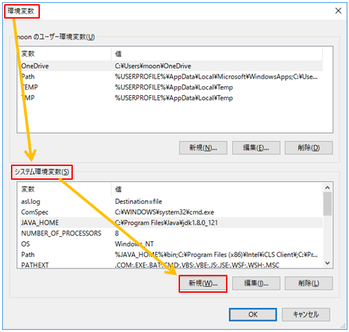 4.「環境変数」ダイアログの「システム環境変数」の「新規」ボタンを押します。