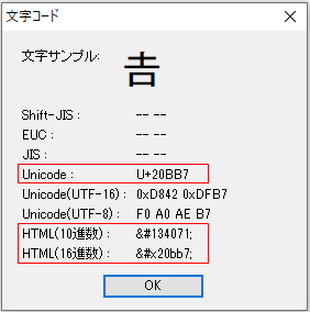 8行目は、サロゲートペアの「つちよし」を表示しています。Unicodeコードポイントのエスケープを使用しています。