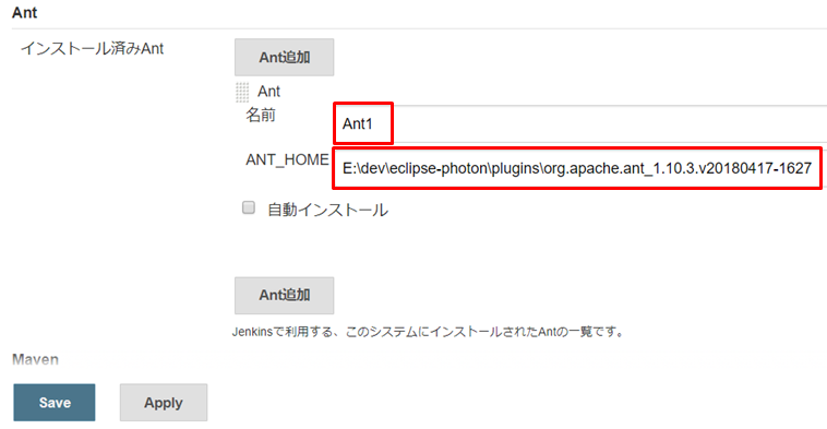「Java_HOME」は、JDKのフォルダを指定します。完了後、Applyボタンを押します。