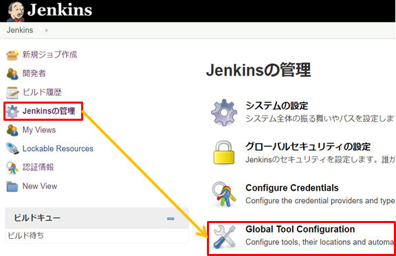 1.「Jenkinsの管理」→「Global Tool Configuration」をクリックします。