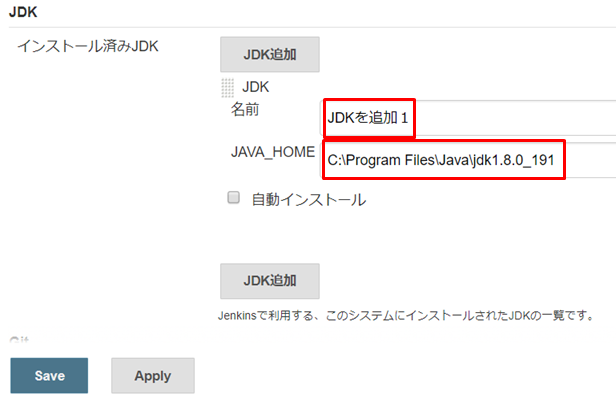 「Java_HOME」は、JDKのフォルダを指定します。完了後、Applyボタンを押します。