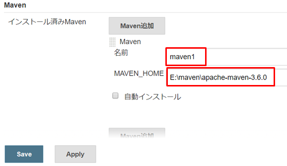 「MAVEN_HOME」は、上記手順で取得し解凍したmavenのフォルダを指定します。パスは、mvnがあるbinフォルダの1つ上のフォルダまでを指定します。完了後、Saveボタンを押します。