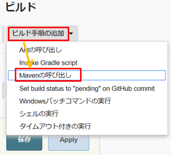 3.「ビルド手順の追加」をクリックし、「Mavenの呼び出し」をクリックします。