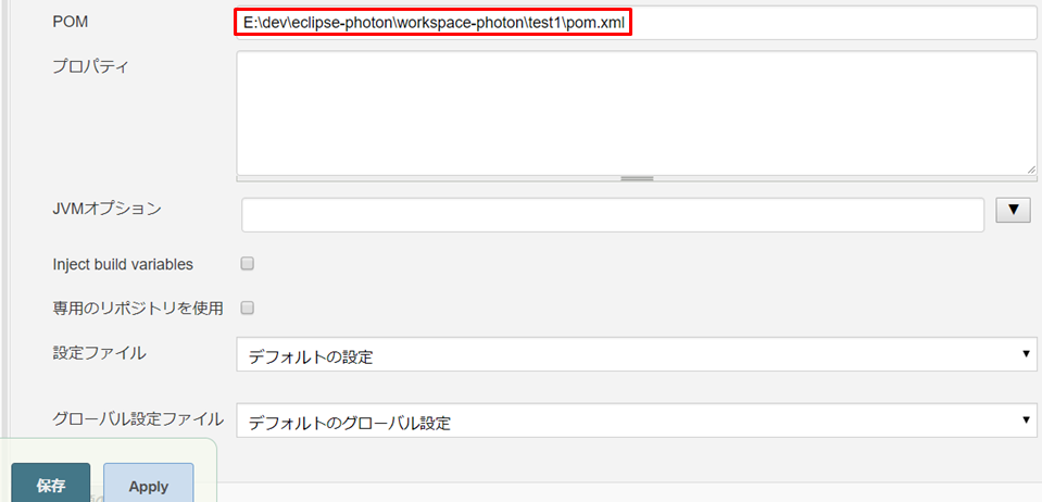 5.「POM」にEclipseで設定したpom.xmlをパス付きで入力し、保存ボタンを押します。