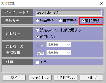 2.登録方法で即時実行を選択してOKをクリックします。処理が実行されます。