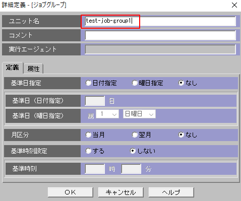 2.ユニット名にジョブグループ名を入力します。OKを押します。test-job-group1