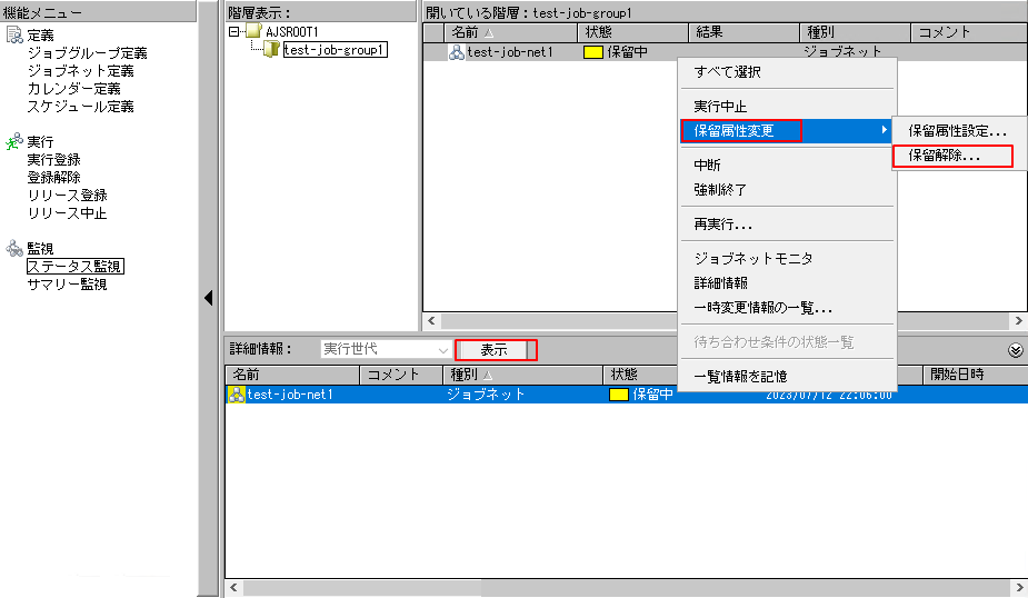 下の表示されたジョブネットを右クリックし「保留属性変更」>「保留解除」をクリックします。