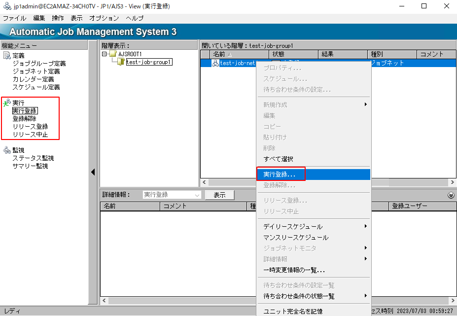 1.機能メニューの実行の「実行登録」を選択し、作成したジョブグループを右クリックして実行登録をクリックします。