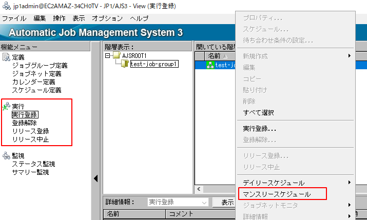 1.機能メニューの実行の「実行登録」を選択し、作成したジョブグループを右クリックしてマンスリースケジュールをクリックします。