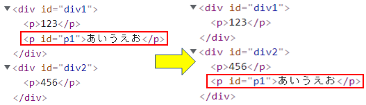 $("#p1").appendTo("#div2");とした場合、<div id="div2">の子要素の最後に移動します。
