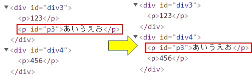 $("#p3").prependTo("#div4");とした場合、<div id="div4">の子要素の先頭に移動します。