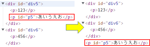 $("#p5").insertAfter("#div6");とした場合、<div id="div6">の後ろに移動します。