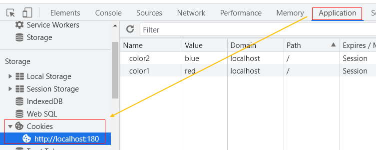 「F12」キーを押してデベロッパーツールを開き、「Application」→「Cookies」→「http://localhost」をクリックします。