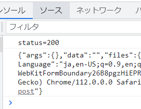 23,27行目の.thenは、成功した時にそれぞれ実行されます。以下のようにコンソールにstatusとJSONが表示されます。