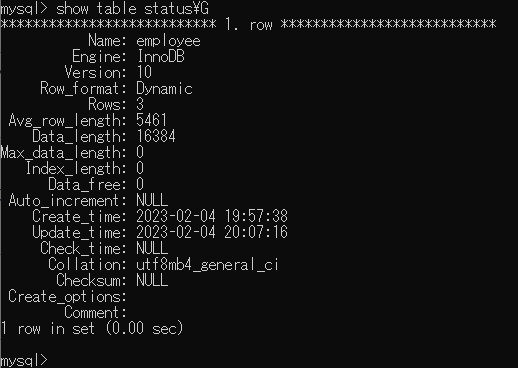 ROW_FORMATをDYNAMICに変更する alter table employee row_format=DYNAMIC;