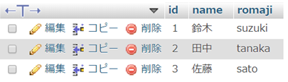 ブラウザのURLに以下のアドレスを入力すると画面にDBのデータが表示されます。