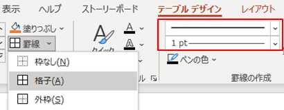 2.「テーブルデザイン」から罫線を選択して格子を選択すると枠線が引かれます。