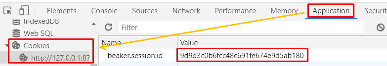 「F12」キーを押してデベロッパーツールを開き、「Application」→「Cookies」→「http://localhost」をクリックします。